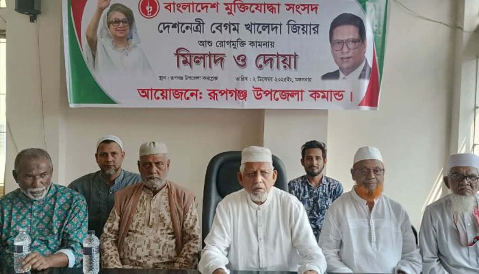 বাংলাদেশ জাতীয়তাবাদী দল (বিএনপি)-এর চেয়ারপার্সন এবং সাবেক প্রধানমন্ত্রী বেগম খালেদা জিয়ার আশু রোগমুক্তি ও সুস্থতা কামনায় নারায়ণগঞ্জের রূপগঞ্জে দোয়া ও মিলাদ মাহফিল অনুষ্ঠিত হয়েছে।