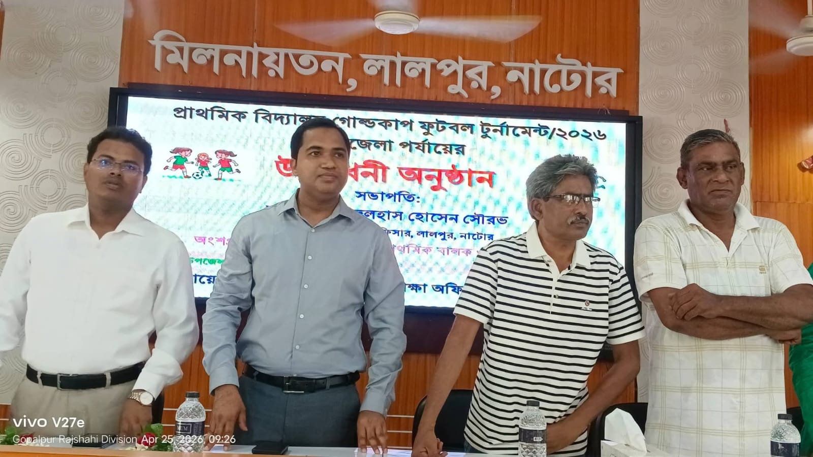 নাটোরের লালপুরে প্রাথমিক বিদ্যালয় গোল্ডকাপ ফুটবল টুর্নামেন্ট–২০২৬ (উপজেলা পর্যায়) এর উদ্বোধনী অনুষ্ঠান উৎসবমুখর পরিবেশে অনুষ্ঠিত হয়েছে।