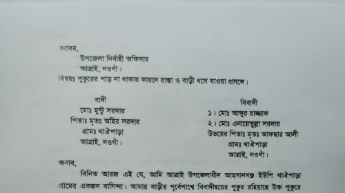আত্রাইয়ে পুকুর পাড় না বাঁধায় হুমকিতে সড়ক ও বসতবাড়ি, প্রতিকার চেয়ে ইউএনও’র কাছে অভিযোগ
